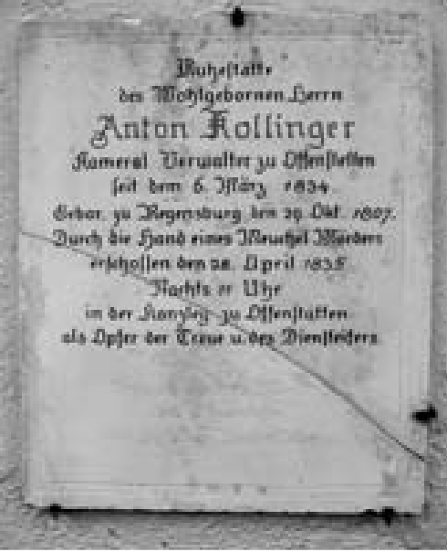 (rm) „Anton Kollinger, Kameralverwalter zu Offenstetten, seit 6. März 1834. Geboren zu Regensburg, den 29. Okt. 1807. Durch die Hand eines Meuchelmörders erschossen, am 28. April 1835, in der Kanzlei zu Offenstetten, als Opfer der Treue und des Diensteifers. Verzeihung dem Mörder, dem Ermordeten eine fröhliche Auferstehung.“